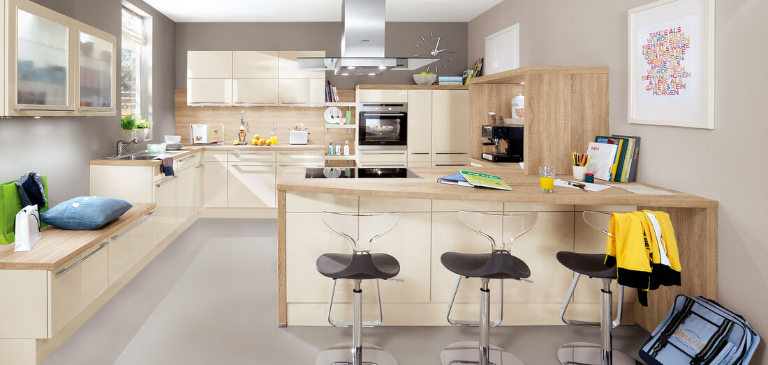 Lassen Sie sich von modernen Designs, hochwertigen Fronten und widerstandsfähigen Arbeitsplatten begeistern. In Ihrer neuen Küche können Sie ganz entspannt das neue Rezept mit Liebe zubereiten und gleichzeitig Zeit mit Ihrer Familie verbringen. Vielleicht kochen Sie auch mal gemeinsam mit Ihren Kindern leckere Gerichte und zeigen den Kleinen Ihre Tricks. Diese Küche wird zum Mittelpunkt Ihres Familienlebens und ermöglicht Ihnen schöne Momente im Familienalltag.